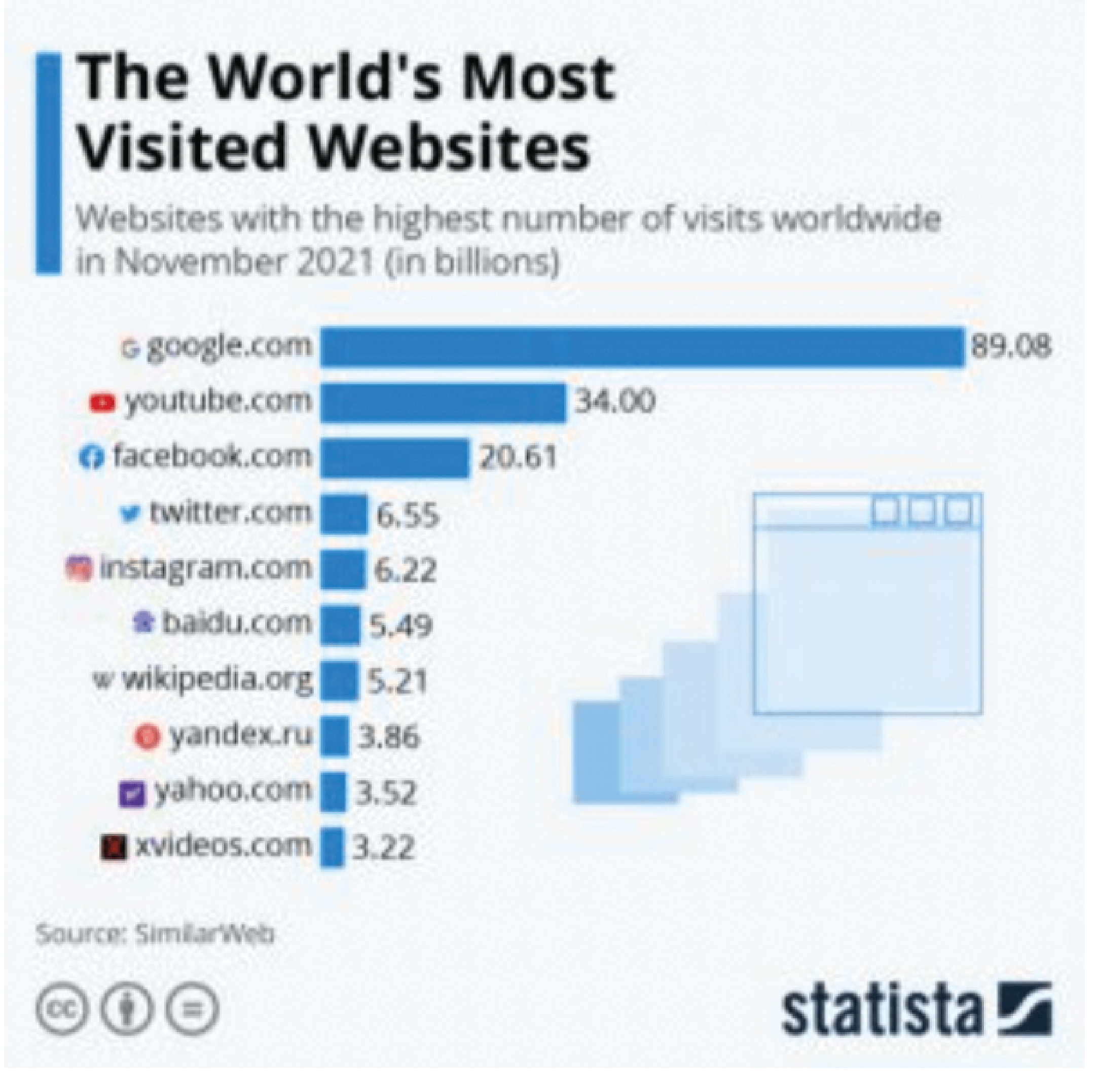 Secondo i dati statistici di Similarweb del novembre 2021, Google è il sito più visitato al mondo con 89,08 miliardi di visite annuali. Inoltre viene usato più di 3 volte al giorno in media da ogni suo utente.